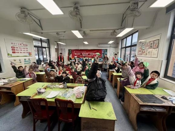 “未来纸飞机”环节将氛围推向高潮。志愿者为孩子们分发彩纸,大家趴在桌上认真写下心中梦想——“成为航天工程师”“做环保科学家”“当建筑设计师”,字里行间满是对未来的憧憬。志愿者轻声鼓励:“每一个梦想都值得尊重,每一分努力都能照亮前路”,引导孩子们将个人理想融入强国建设、民族复兴的征程。随后,孩子们高高举起纸飞机,奋力掷向天空,五彩的纸飞机带着梦想盘旋,校园里回荡着清脆的笑声。