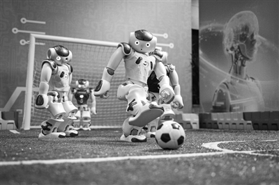 图为人形机器人在湖北省加快建成中部地区崛起的重要战略支点推进大会上表演踢足球