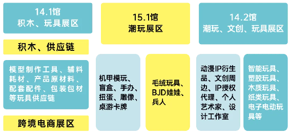 潮玩、积木、毛绒玩具、盲盒、手办、扭蛋、机甲模玩、雕像、卡牌、桌游、BJD娃娃、兵人、动漫IP衍生品、文创周边、IP授权代理、个人艺术家、设计工作室、智能玩具塑胶玩具、木质玩具纸类玩具、电子电动玩具、供应链等。